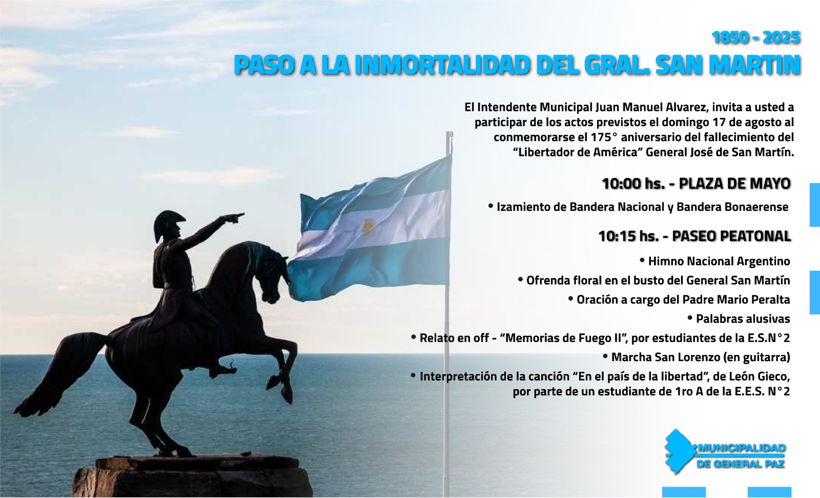 El Intendente Municipal Juan Manuel Álvarez, invita a usted a participar de los actos previstos al conmemorarse el 175ª aniversario del fallecimiento del “Libertador de América”, General José de San Martín, el próximo domingo 17 de agosto.