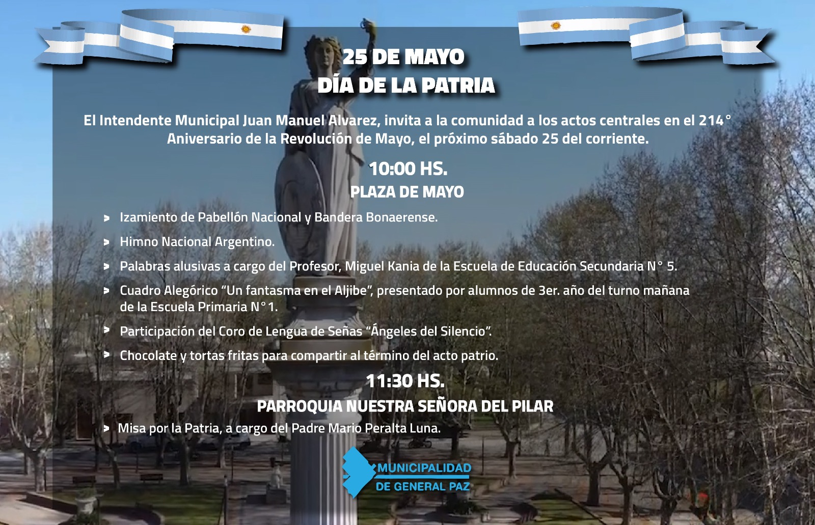 El Intendente Municipal Juan Manuel Álvarez, tiene el agrado de invitar a la comunidad a los actos programados con motivo de cumplirse el 214° Aniversario de la Revolución de Mayo, el próximo sábado 25 del corriente.