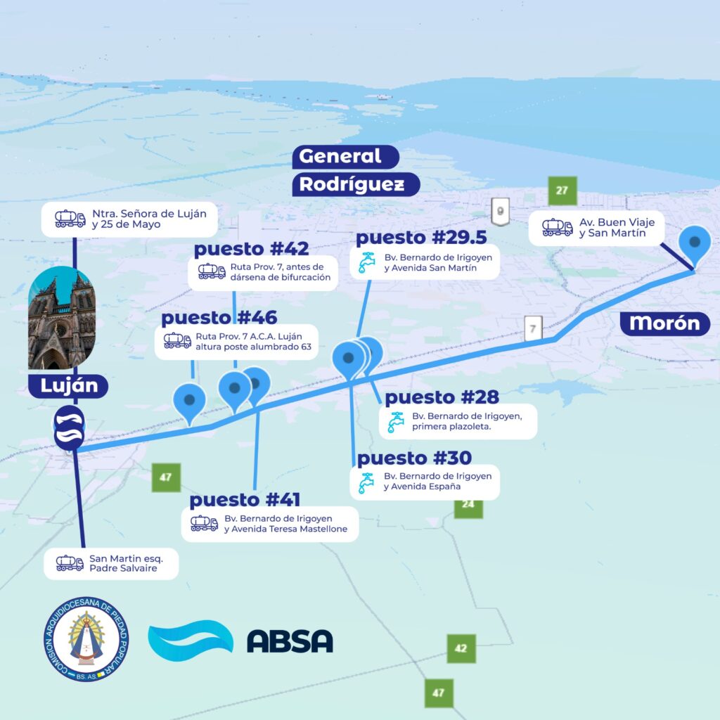 La ubicación de los puestos de asistencia a los peregrinos fue coordinada con la Comisión Arquidiocesana de Piedad Popular, organizadora del evento, y dependencias del Estado bonaerense intervinientes. Tras lo acordado, se colocarán cisternas fijas y móviles para la carga y recarga de agua en las siguientes posiciones: