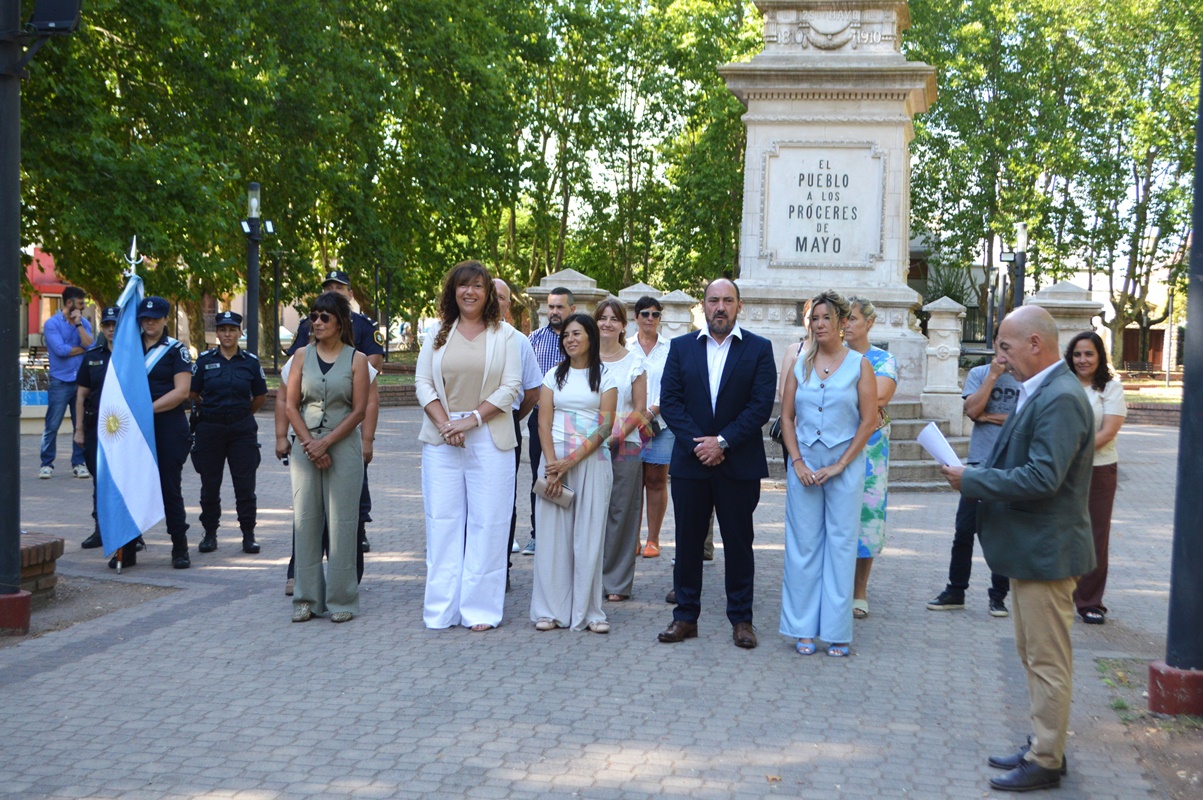 Dando continuidad con lo protocolar, la Bandera Bonaerense estuvo a cargo de la Subsecretaria de Seguimiento Productivo y Económico de la Jefatura de Asesores, Dra. Ayelén Borda, junto a la Presidenta del Consejo Escolar, Carmen Ruiz. Mientras que el Paño de Ranchos fue izado por la Presidenta del HCD, Dra. Ana Clara Álvarez y la Concejal Carina Soberón.