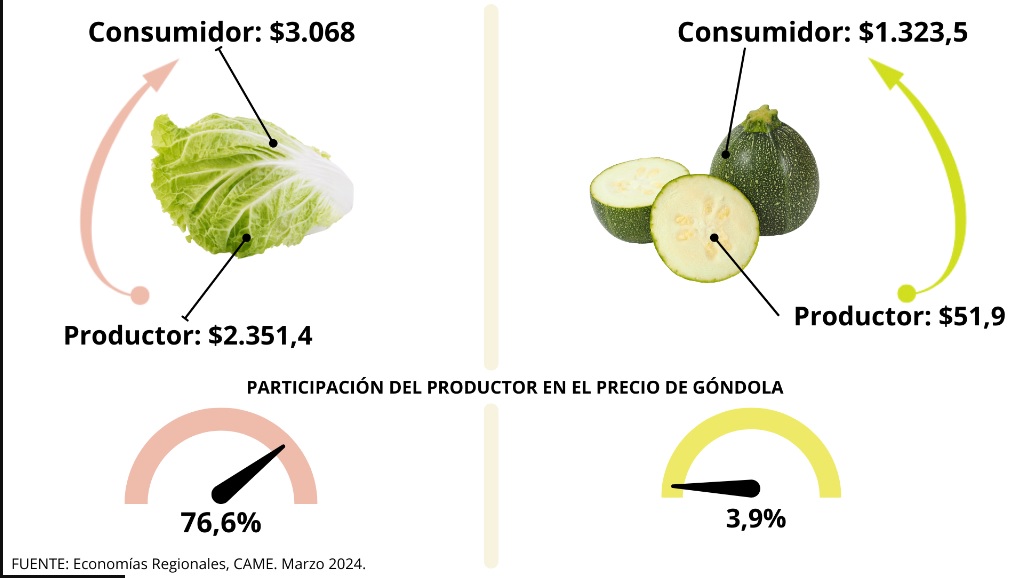 En promedio, la participación del productor explicó el 31,3% de los precios de venta final. La mayor participación la tuvieron los productores de lechuga (76,6%), mientras que la menor fue para los de zapallito (3,9%).