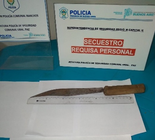 Por tal motivo, se lo redujo, y se incautó el cuchillo que exhibía y amenazaba a su oponente, quedando aprehendido por el delito de “Lesiones Leves y Amenazas agravadas”, tomando intervención la Ayudantía Fiscal Local.