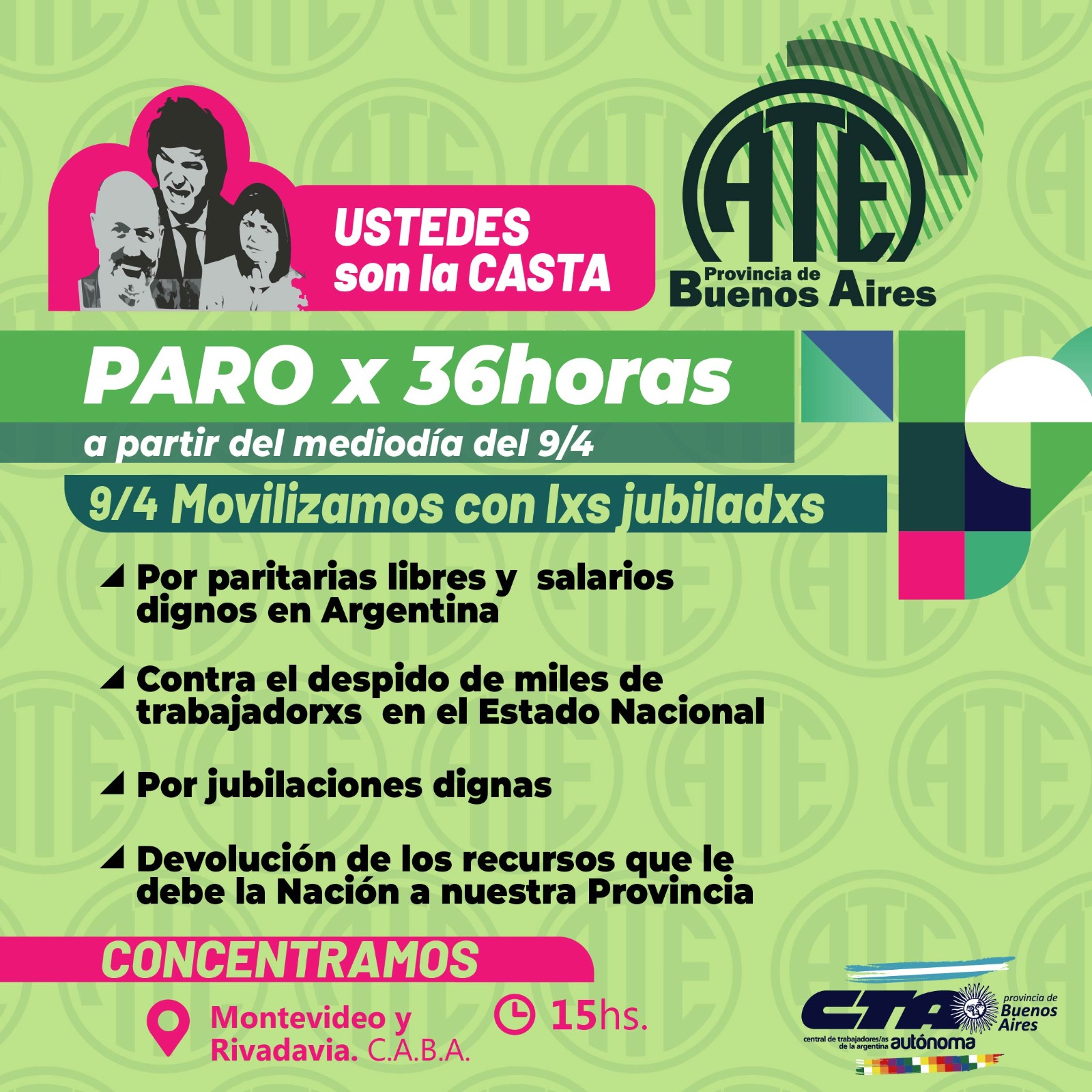POLÍTICAPORTADAPROVINCIALES ATE provincia adhiere al paro nacional Por celesterastelli - 7 abril, 2025 0 4 FacebookTwitterPinterestWhatsApp La Asociación de Trabajadores del Estado (ATE) anunció un paro nacional de 36 horas que comenzará el 9 de abril al mediodía y se extenderá hasta la medianoche del 10 de abril. ATE provincia de Buenos Aires se adhiere a la medida