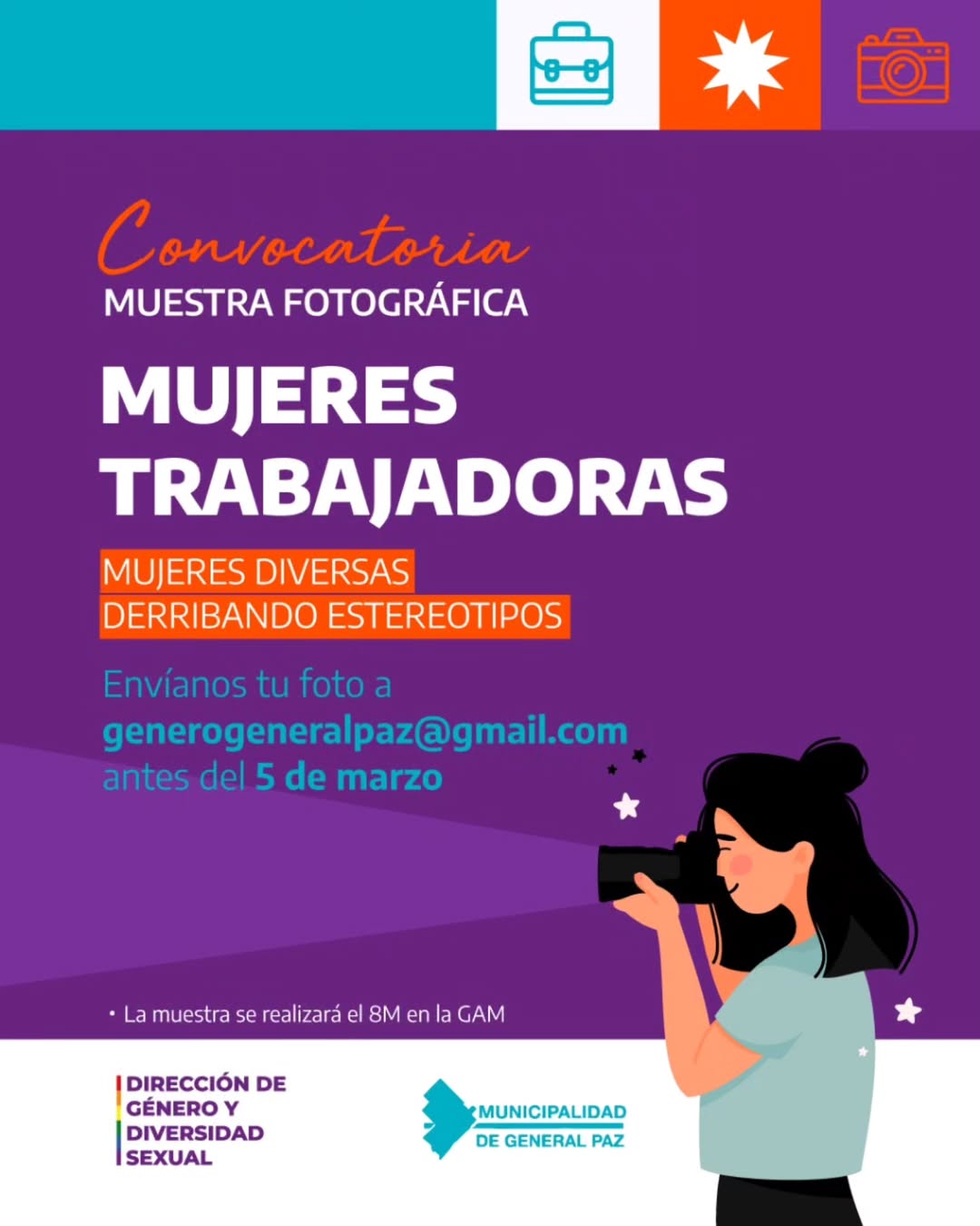 a Dirección de Género y Diversidad Sexual invita a formar parte de una muestra fotográfica que visibiliza los distintos lugares que ocupan las mujeres hoy: rompiendo esquemas, en espacios que antes les fueron negados, en tareas históricamente invisibilizadas.