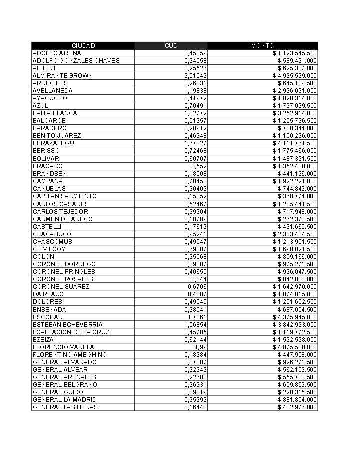 Si consideramos que el 70% que distribuirá el Ejecutivo a través del Coeficiente Único de Distribución (CUD) conocido horas atrás, y que conformaría un monto de U$S 245.000 millones, cada distrito podría recibir la siguiente cantidad de fondos: