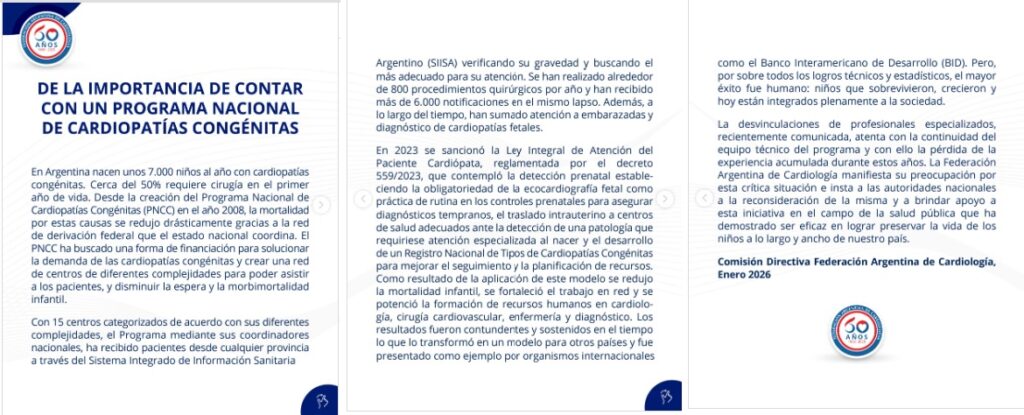 Y agregó: “Las desvinculaciones de profesionales especializados, recientemente comunicada, atenta con la continuidad del equipo técnico del programa y con ello la pérdida de la experiencia acumulada durante estos años. La Federación Argentina de Cardiología manifiesta su preocupación por esta crítica situación e insta a las autoridades nacionales a la reconsideración de la misma y a brindar apoyo a esta iniciativa en el campo de la salud pública que ha demostrado ser eficaz en lograr preservar la vida de los niños a lo largo y ancho de nuestro país”.