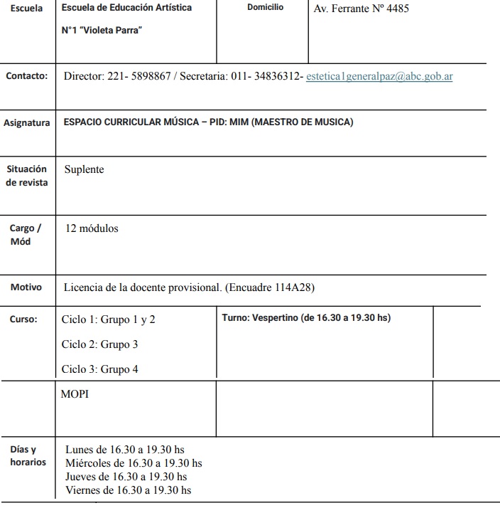 Secretaría de Asuntos Docentes de General Paz, a solicitud de la Inspectora de Ed. Artística Prof. ANDREONI Analisa, llama a difícil cobertura para módulos de MIM (maestro de música) para EEA N°1 de General Paz