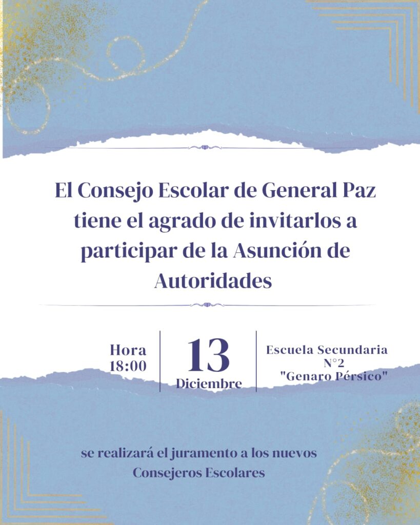 Los actos correspondientes a la jura de los Consejeros Escolares y Concejales electos en la pasada elección del 7 de septiembre, se llevarán delante de manera conjunta en la escuela Secundaria Nº 2 “Genaro pérsico”.
