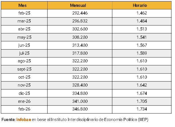El salario mínimo nominal tuvo incrementos casi todos los meses del período analizado, pero estos aumentos no lograron superar la inflación. En diciembre de 2023, se produjo una caída del 15%, seguida por otra de 17% en enero de 2024. Posteriormente, los incrementos nominales mensuales (de $292.446 en febrero de 2025 a $346.800 en febrero de 2026) resultaron insuficientes frente al alza de los precios, lo que acentuó la pérdida de poder adquisitivo.