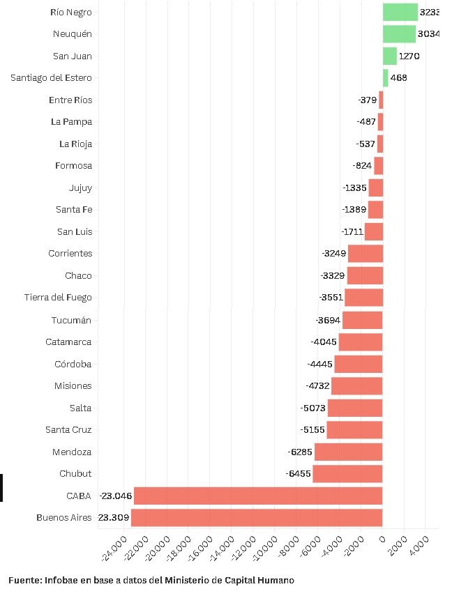 En el plano provincial, el empleo privado descendió en catorce provincias, con las mayores caídas porcentuales en Tierra del Fuego (-3,2%), Corrientes (-0,9%) y Formosa (-0,8%). Los aumentos más relevantes se registraron en La Rioja, Neuquén, Río Negro y Santa Cruz. La Ciudad Autónoma de Buenos Aires fue el principal motor de la reducción general.