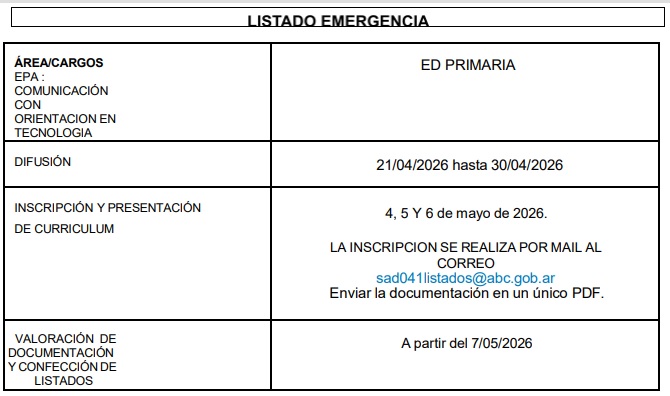 Secretaría de Asuntos Docentes de General Paz, a solicitud de la Inspector Jefe Distrital PANCIROLI Martin realiza el llamado a Listado de EMERGENCIA para cobertura EPA COMUNICACIÓN CON ORIENTACION EN TECNOLOGIA para EP N°5 del Distrito de GENERAL PAZ según Disposición Conjunta 01/16