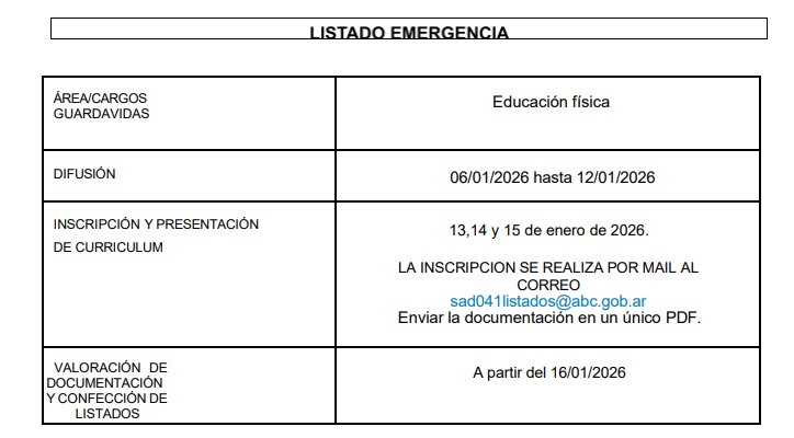 Secretaría de Asuntos Docentes de General Paz, a solicitud de la Inspectora de la Modalidad de Educación Física, Sabrina Suller, realiza el llamado a Listado de EMERGENCIA para cobertura de horas cátedras de GUARDAVIDAS según Disposición Conjunta N°3/11 y Disposición N°1/14.