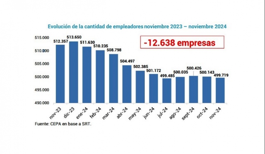 De acuerdo con el trabajo de CEPA, entre noviembre de 2023 y noviembre de 2024, en términos absolutos, se redujo la cantidad de empleadores en 12.638 casos, siendo el “Servicio de transporte y almacenamiento” el sector más afectado, con una pérdida de 2.564 empleadores.