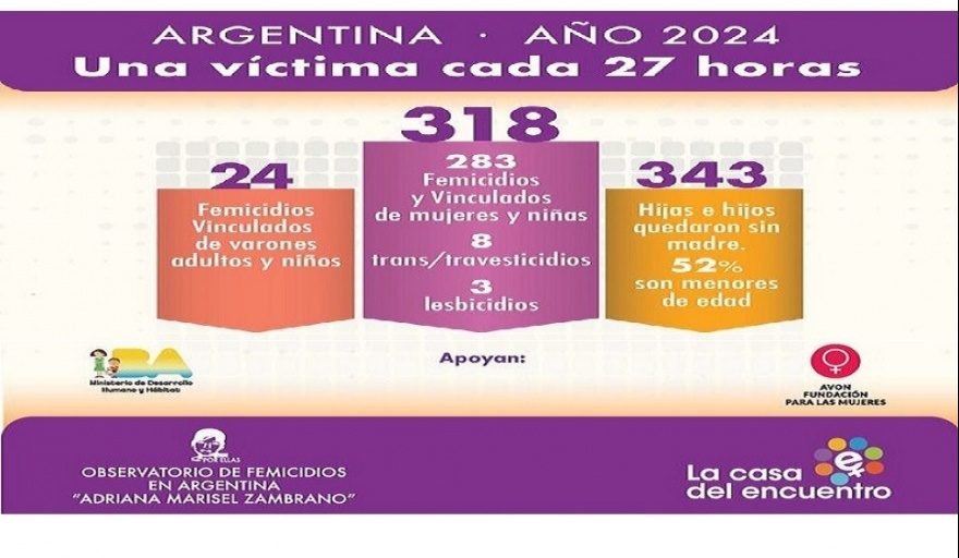 El Observatorio de Femicidios en Argentina “Adriana Marisel Zambrano”, dirigido por La Casa del Encuentro, documentó 318 muertes violentas por razones de género a lo largo de 2024, lo que equivale a una víctima cada 27 horas.