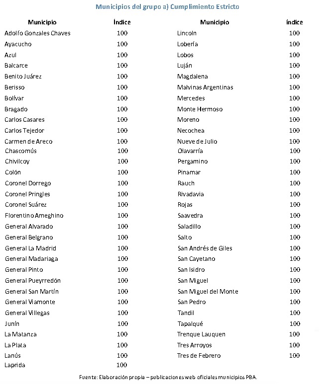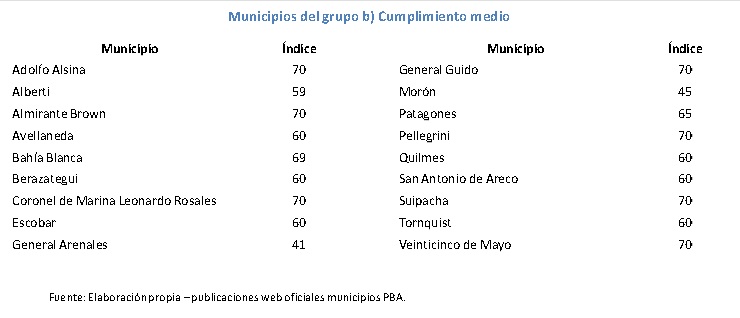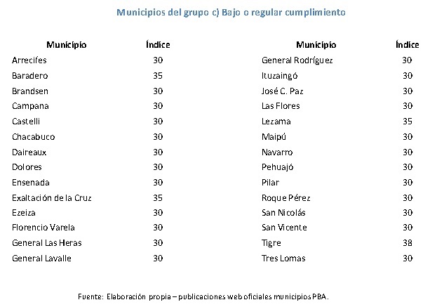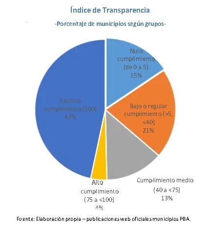 De acuerdo con el estudio realizado, 63 municipios (casi el 47 %), alcanzan el puntaje ideal, registrando un cumplimiento estricto. Por otro lado, cinco municipios obtienen un nivel mayor o igual a los 75 puntos obteniendo un nivel alto de visualización en el índice de transparencia propuesto en el presente informe. Respecto al resto de los municipios, 18 son los distritos que se ubican en un nivel medio; mientras que 28 exponen un cumplimiento bajo o regular, y los restantes 21 bajo o nulo.