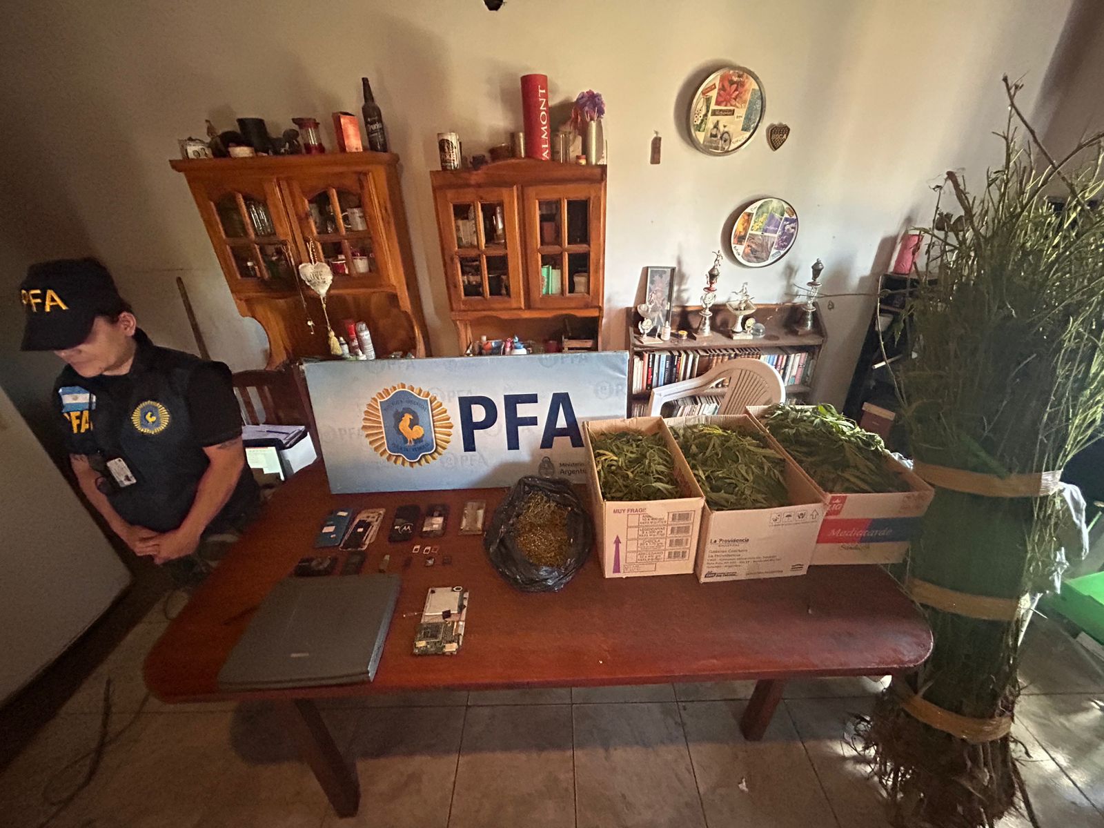 Mientras se llevaba la medida judicial, con resultado favorable en la investigación mediante el secuestro de varios celulares, pendrives, soportes técnicos, etc.; y elementos de interés de la causa; el personal interventor fue sorprendido por el hallazgo de varias plantas de marihuana en el patio trasero de la vivienda; dando cuenta del hecho, en este caso a la Fiscalía de Ayudantía de Estupefacientes de Chascomús a cargo del Dr. Jorge Larrarte, lográndose el secuestro de varias plantas de marihuana, con un pesaje aproximado de más de 20 kilogramos y varias semillas.
