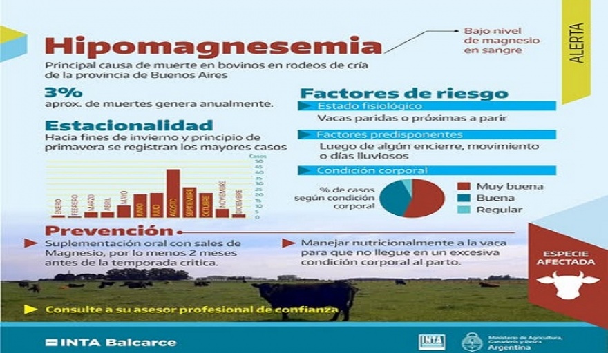 Desde el INTA recomiendan tomar medidas preventivas, como la suplementación oral de magnesio en los meses críticos, evitar pasturas con exceso de nitrógeno o potasio, y controlar el estado corporal de los animales. Ante síntomas, se aconseja el suministro intravenoso de soluciones de magnesio y calcio, aunque hasta un 30% de los animales tratados podría no recuperarse.