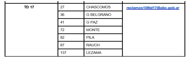 Por ejemplo: si la/el aspirante posee residencia consignada en el DNI en el distrito de Campana, deberá escribir el correo electrónico al Tribunal Descentralizado 11: reclamos108td11@abc.gob.ar
