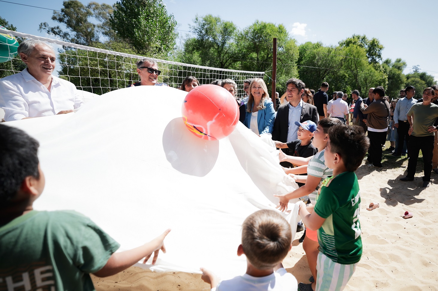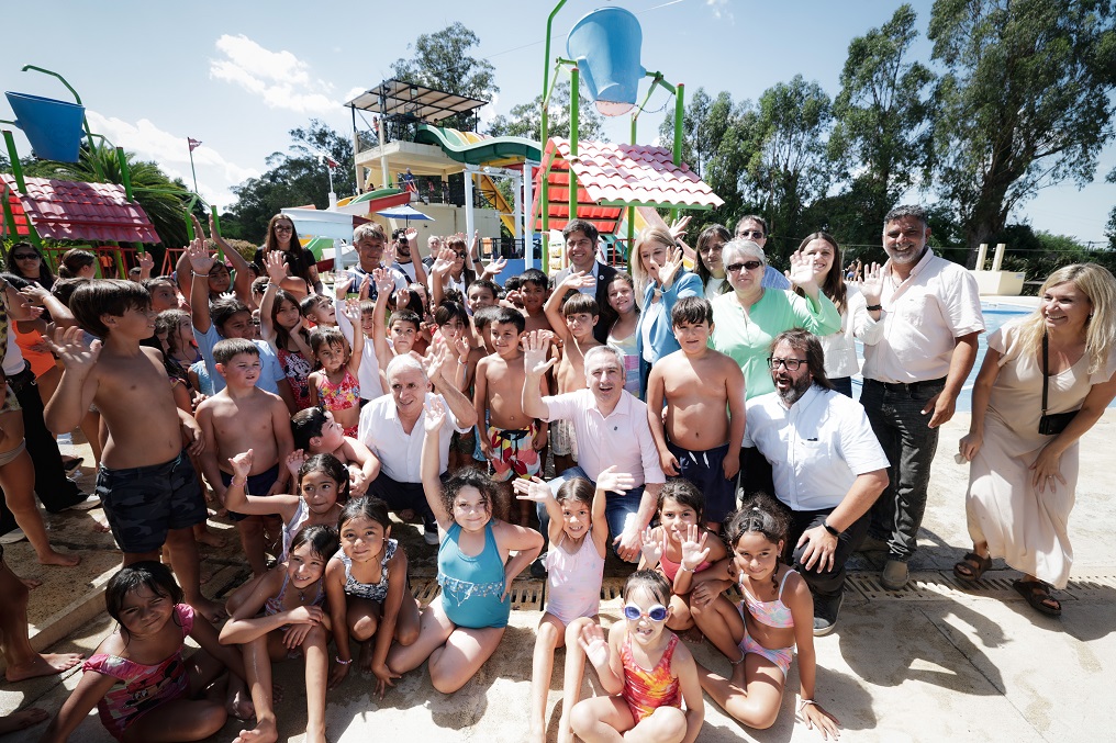 Durante la jornada, Kicillof y la directora general de Cultura y Educación, Flavia Terigi, recorrieron el parque acuático Puerto Aventura, donde niñas y niños de diferentes escuelas locales participan de actividades recreativas en el marco del programa Escuelas Abiertas en Verano.