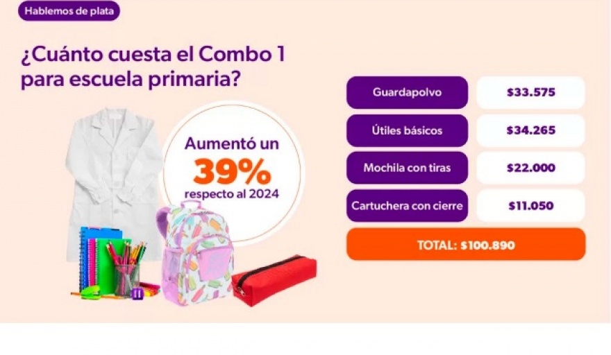 Al sumar el precio de los útiles y la mochila con un guardapolvo unisex de primera marca ($33.575) y una cartuchera básica ($11.050), el Combo 1-Primaria alcanza un costo de $100.890, un 39% más que en 2024, cuando costaba $72.449.