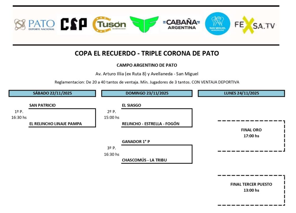 Aún queda pendiente la final de la Copa Argentina entre los equipos de San Patricio, liderado por Facundo Taberna, y el equipo de Juan Ignacio Lanfranco, El Relincho – La Estrella – El Fogón. Se estima que el cruce definitorio sea durante las clasificaciones del Abierto Argentino de Pato.