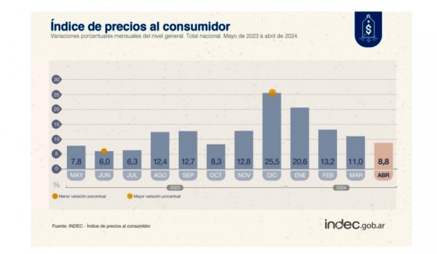 El Nivel general del Índice de precios al consumidor registró un alza mensual de 8,8% en abril de 2024, y acumuló, en lo que va del año, una variación de 65,0%. En la comparación interanual, el incremento alcanzó el 289,4%. Respecto al mes anterior, el IPC bajó 2,2%, pero a costa de una caída del consumo del 20,4%. Los rubros de mayor aumento en el mes fueron Vivienda, agua, electricidad, gas y otros combustibles (35,6%).