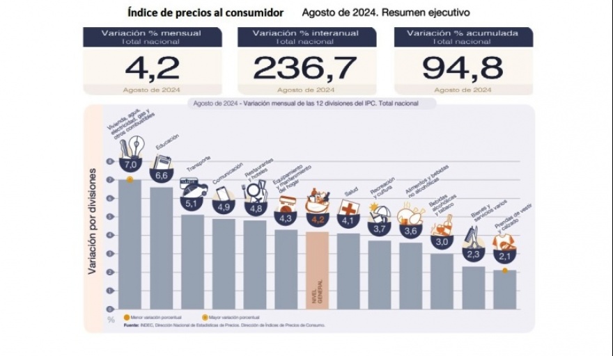 El Nivel general del Índice de precios al consumidor registró un alza mensual de 4,2% en agosto de 2024, y acumuló en el año una variación de 94,8%. En la comparación interanual, el incremento alcanzó el 236,7%.