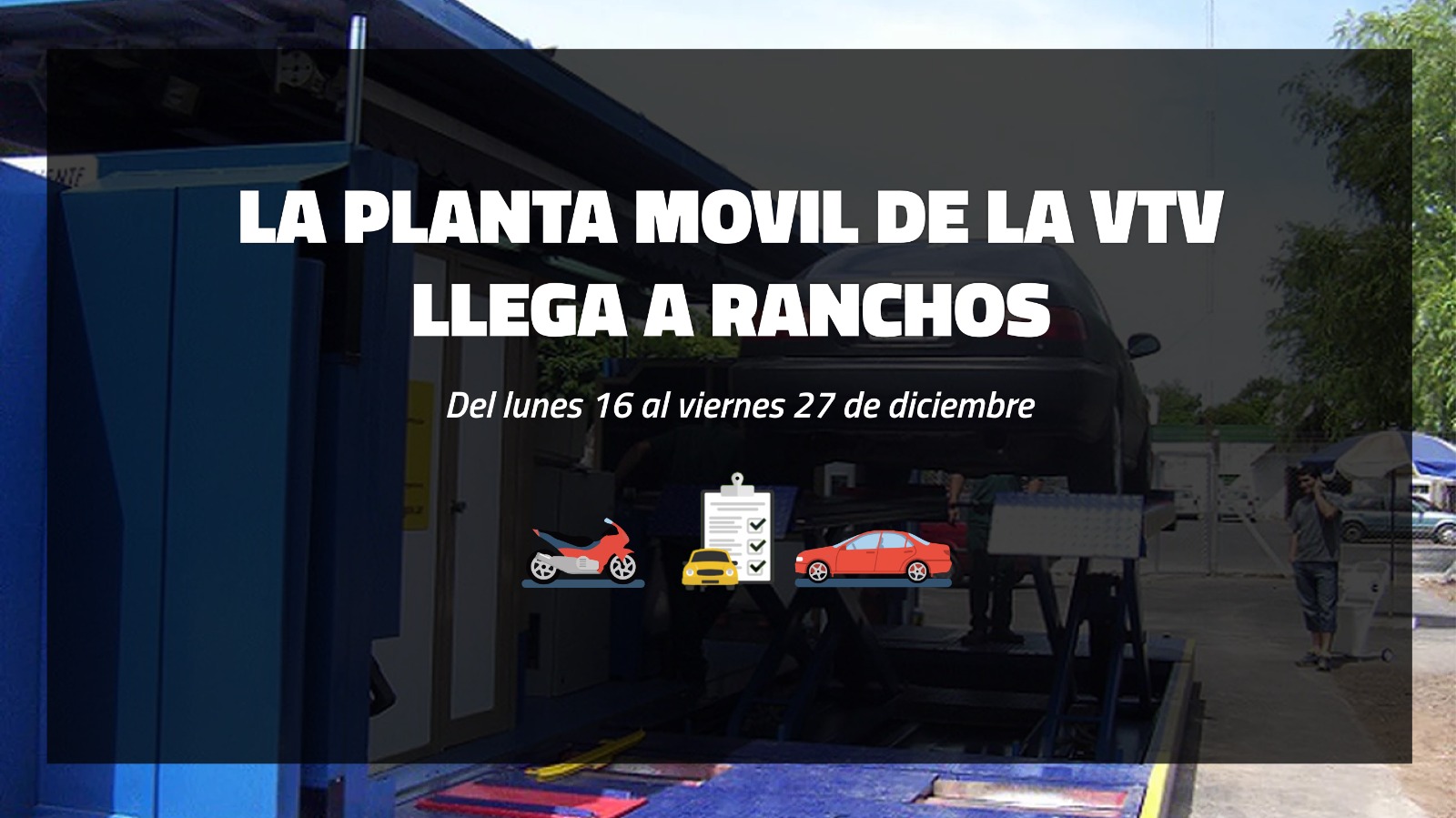 A partir del próximo lunes 16 de diciembre y hasta el viernes 27 de ese mes, la planta móvil de Verificación Técnica Vehicular llega a Ranchos y se instalará en la calle España entre Ameghino y Avenida Campomar, frente al Centro de Educación Física.