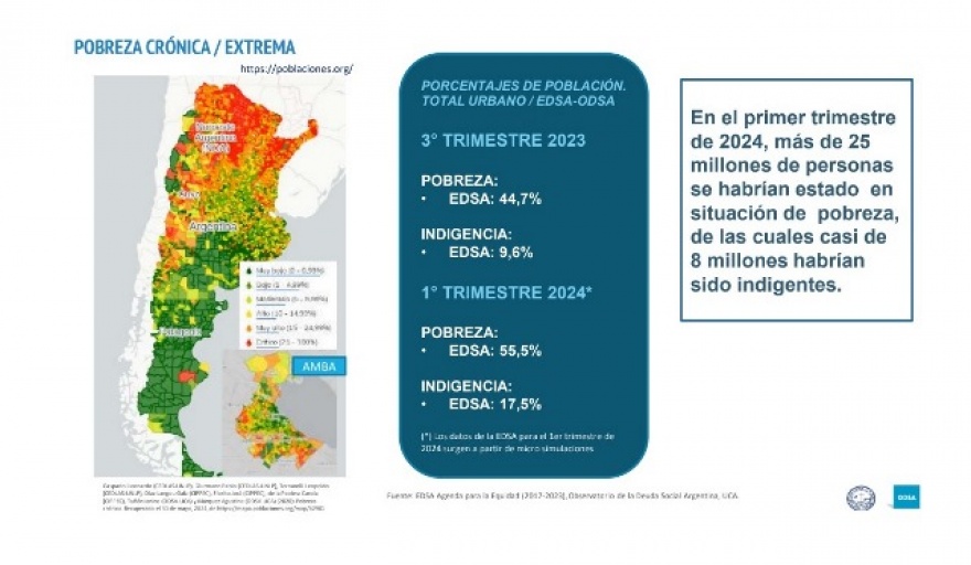A partir de los datos preliminares del ODSA UCA, correspondientes al 3° trimestre de 2023 y las estimaciones para el 1° trimestre de 2024, el indicador de pobreza se incrementó de 44,7% de la población a 55,5% y el de indigencia de 9,6% a 17,5%. Por lo que, en el primer trimestre de 2024, 24,9 millones de personas residentes en áreas urbanas se encuentran en situación de pobreza (por debajo de la CBT), entre las cuales, 7,8 millones de personas en estado de pobreza extrema o indigencia (por debajo de la CBA). Índices parecidos a los que el menemismo alcanzó, pero en sus 10 años de gobierno.