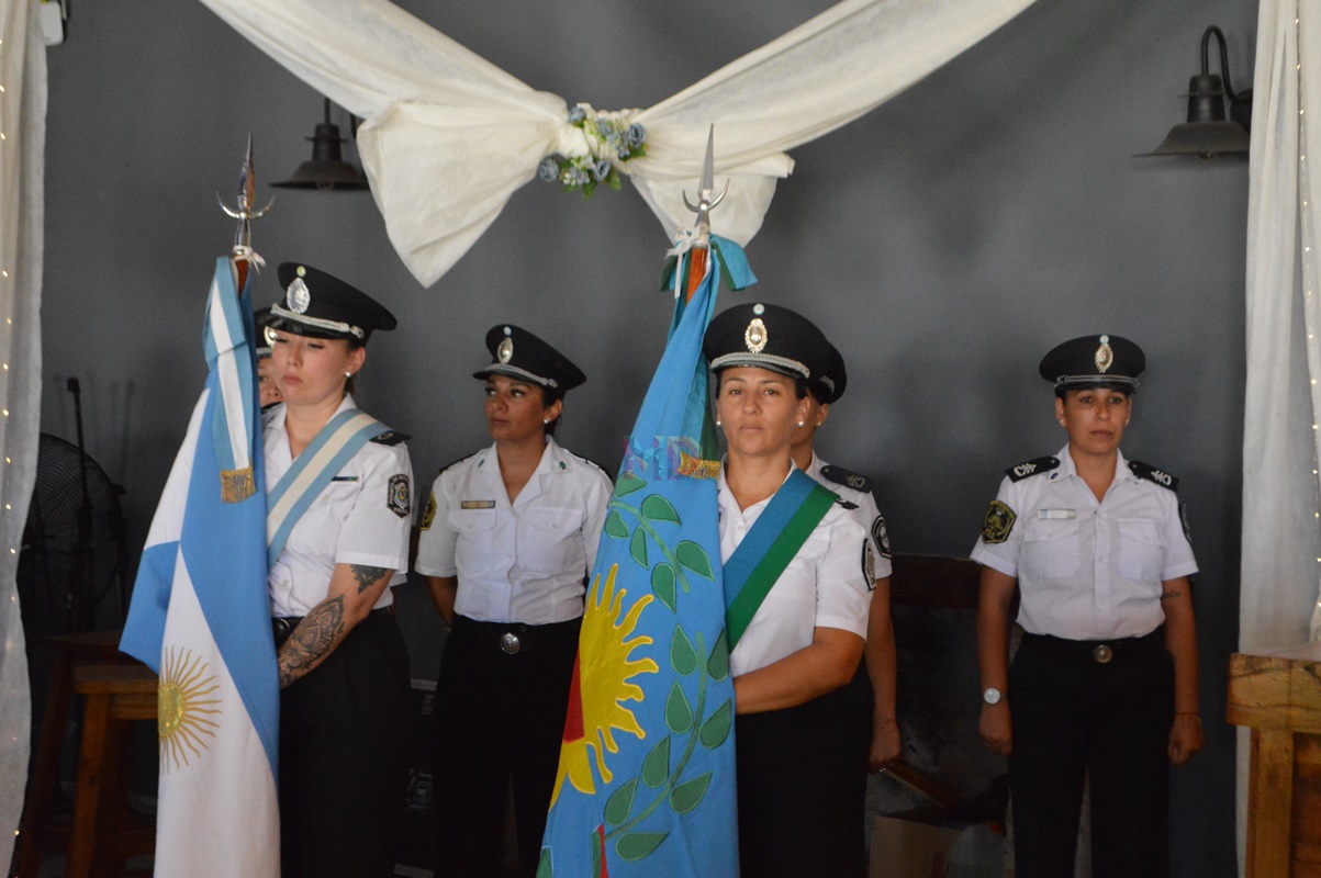 Para dar inicio al acto fueron recibidas las banderas de ceremonia. La Bandera Nacional portada por la Sargento Noelia Mariam Lois, acompañada por las escoltas, Sargento Farisano Florencia y Sargento Golisano Karina. La Bandera Bonaerense fue portada por la Sargento Nociti Cintia Beatriz. Primer Escolta: Sargento Girod Yamila Belén y la Segundo Escolta: Sargento De Gregorio Martina Anabel.