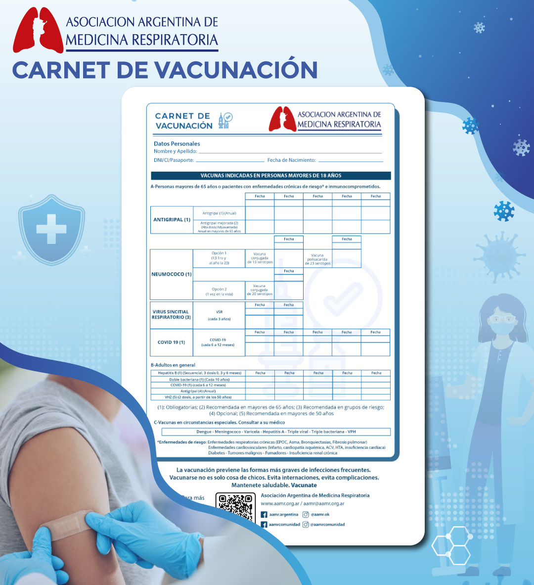 El carnet busca facilitar el seguimiento de esquemas de vacunación completos y adaptados a cada etapa de la vida adulta, fomentando el diálogo entre pacientes y profesionales de la salud. Es clave que el seguimiento de la vacunación y las recomendaciones sobre el esquema de dosis sean realizadas por un profesional de la salud. Para acceder al carnet digital de manera gratuita ingresar a www.aamr.org.ar