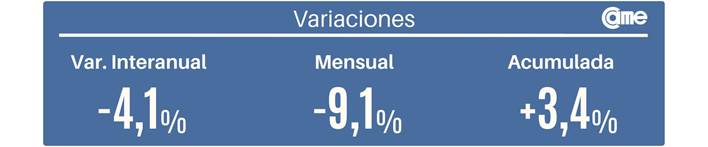 En noviembre, las ventas minoristas pymes registraron una variación interanual de -4,1% a precios constantes. En tanto, en la comparación mensual desestacionalizada, la variación fue de -9,1%. En lo que va del año las ventas acumulan un incremento interanual del 3,4%.
