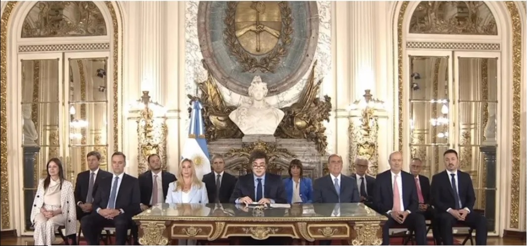 El discurso fue grabado por la tarde en el Salón Blanco de la Casa Rosada, con sus ministros de fondo. La secretaria de Presidencia, Karina Milei, y el jefe de Gabinete, Guillermo Francos, se sentaron junto al Presidente. Entre ellos, se lucieron el titular de la cartera de Economía, Luis Caputo, y la ministra de Seguridad, Patricia Bullrich, los líderes de las áreas que más destacó el Presidente en su balance de gestión.