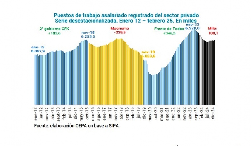 De acuerdo con un trabajo del Centro Política Económica Argentina (CEPA), desde la llegada de Javier Milei al gobierno hasta febrero de 2025, se han perdido 108.053 empleos registrados en el sector privado. Sin embargo, durante el mes de febrero se observó una recuperación de 13.991 puestos.