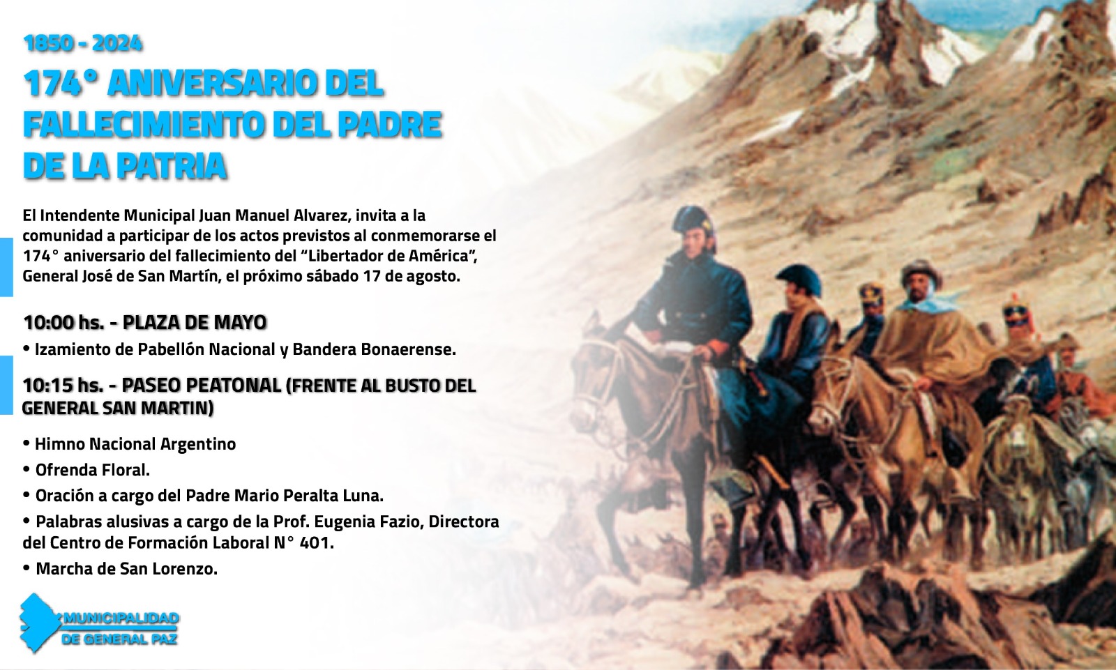 El Intendente Municipal Juan Manuel Álvarez, invita a usted a participar de los actos previstos al conmemorarse el 174º aniversario del fallecimiento del “Libertador de América”, General José de San Martín, el próximo sábado 17 de agosto.