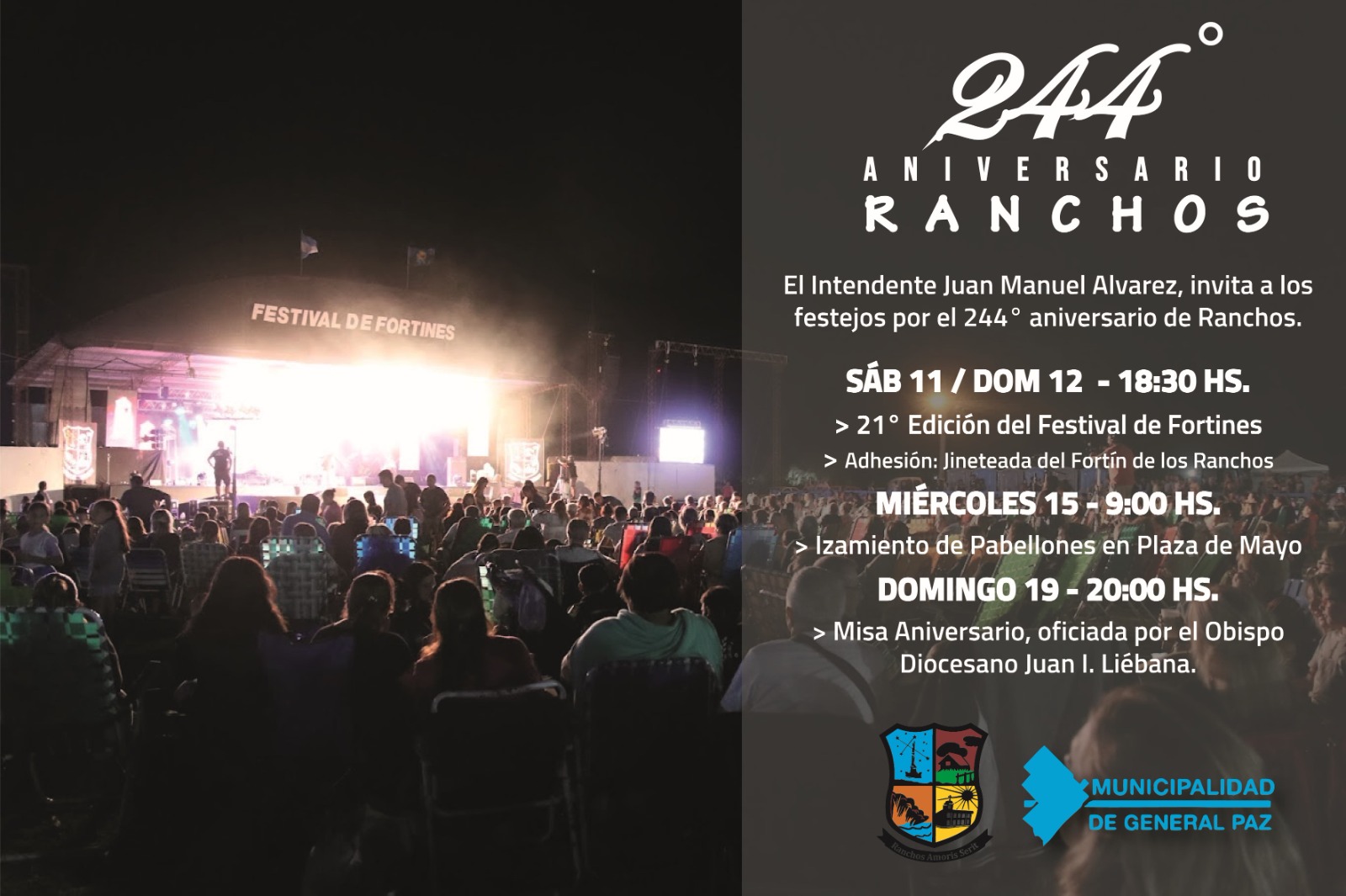 El próximo miércoles 15 de enero, Ranchos celebrará su 244° Aniversario fundacional. El Intendente Municipal de General Paz, Juan Manuel Alvarez, tiene el agrado de invitar a la comunidad a participar de los actos programados con motivo de los festejos.
