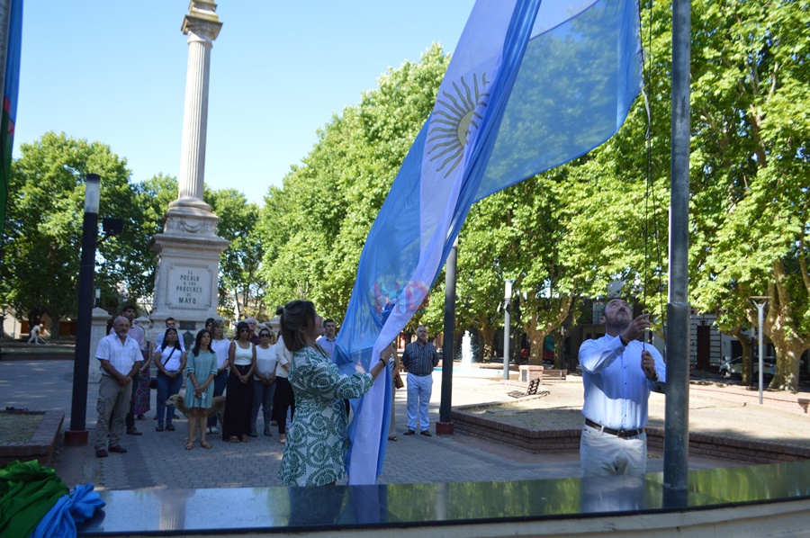 Dando continuidad a los actos, en el día de hoy, las autoridades municipales se congregaron en la Plaza de Mayo para izar el pabellón Nacional, la bandera Bonaerense y el Paño de Ranchos.