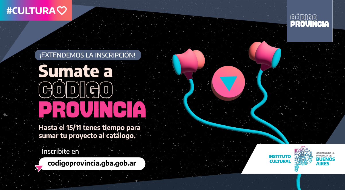 El Instituto Cultural bonaerense anuncia la extensión de inscripciones al catálogo Código Provincia. La convocatoria estará abierta hasta el 15 de noviembre, el registro se podrá realizar de manera online y gratuita a través de la página web del programa. Se trata de una plataforma que funciona como un banco de música creada y producida en la provincia de Buenos Aires, da cuenta de la diversidad territorial y cultural bonaerense con un catálogo de artistas, playlists, producciones radiales, contenidos para medios electrónicos, conciertos, y presencia en festivales.