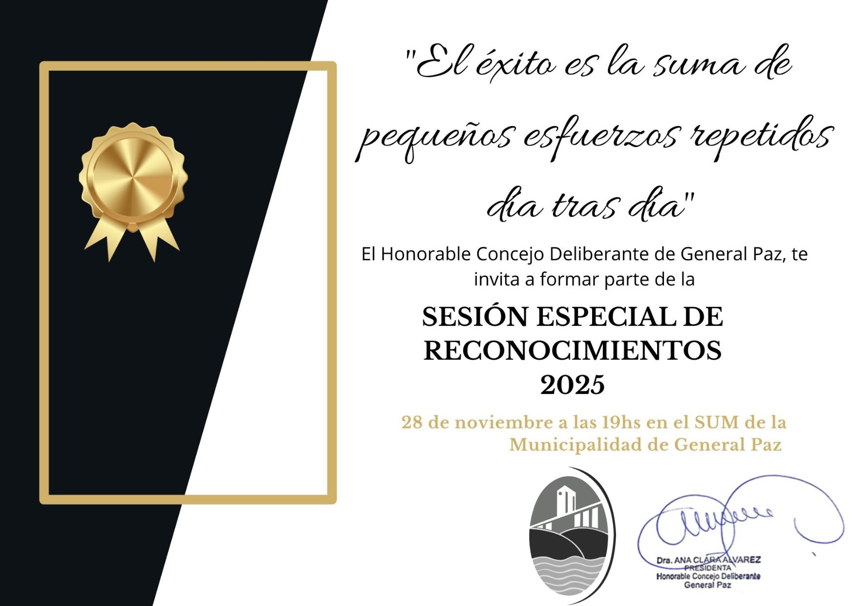 ARTÍCULO 1°: Convócase a las señoras y señores Concejales a Sesión Especial de Reconocimientos para el día VIERNES 28 de noviembre a las 19:00 Hs. a realizarse en el Salón de Usos Múltiples de la Municipalidad de General Paz, a fin de entregar los reconocimientos aprobados por este Honorable Concejo durante el corriente año.————————————————————–