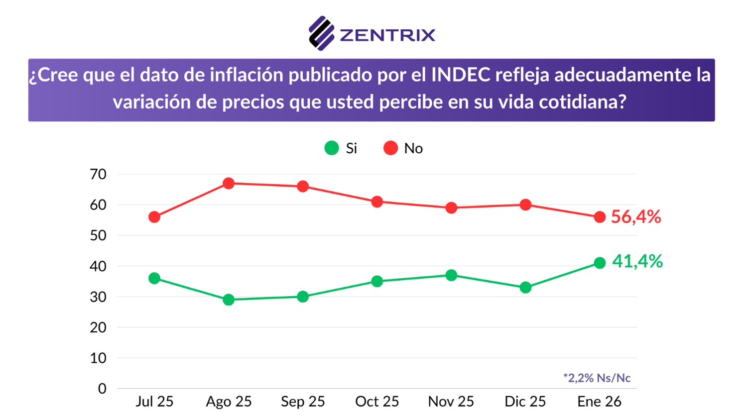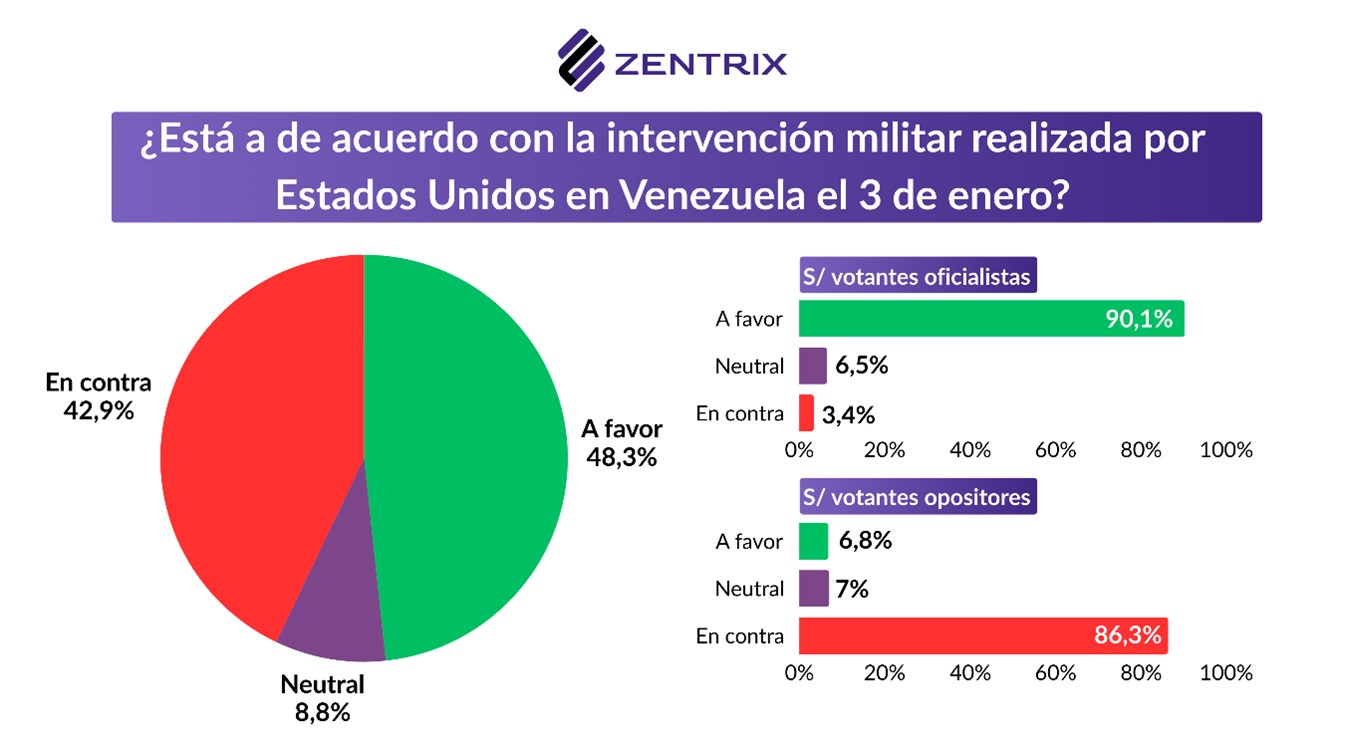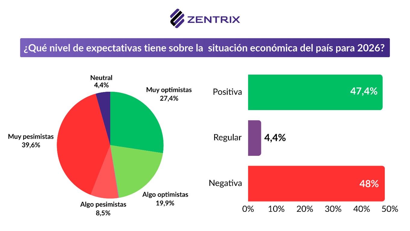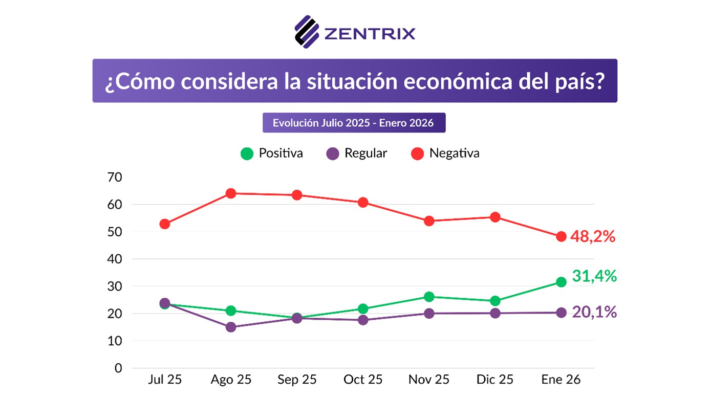 ![]() En el mismo sentido, el relevamiento muestra que la inflación también se discute en el plano de la credibilidad: el 56,4% de los encuestados no cree que el dato del INDEC refleje lo que se vive en la calle, mientras que el 41,4% sí considera que el índice oficial se acerca a su percepción cotidiana. El informe agrega, además, que no se trata de una foto aislada: el gráfico de evolución del MOP exhibe cómo esta percepción fue moviéndose a lo largo de las mediciones, lo que refuerza la brecha entre estadística y experiencia diaria. Esa distancia ayuda a explicar por qué el malestar salarial convive con lecturas políticas más complejas: aun cuando la inflación muestre señales de desaceleración, una parte mayoritaria sigue sintiendo presión en precios clave y ajustes en gastos básicos, y por eso no percibe una mejora inmediata en el consumo real. ![]() La mirada sobre la economía argentina sigue siendo mayoritariamente negativa, pero muestra un giro en el margen. En enero, el 48,2% de los encuestados califica la situación del país como «negativa», mientras que el 31,4% la evalúa como «positiva» y el 20,1% la define como «regular». Aun así, el informe marca que el humor económico empieza a moverse: el gráfico de evolución del MOP muestra que, respecto de mediciones anteriores, creció el porcentaje de quienes ven la economía con mejores ojos. Para muchos la economía todavía no está bien, pero empieza a crecer un segmento que percibe señales de mejora o, al menos, de estabilización. Ese corrimiento ayuda a entender el contraste con el bolsillo: que tres de cada cuatro digan que el salario pierde contra la inflación no impide que mejore la visión del país, porque la evaluación general incorpora expectativas de rumbo y comparación con meses anteriores, incluso cuando el impacto cotidiano siga siendo adverso. Así, mejora la percepción sobre el «país» mientras la economía doméstica continúa bajo presión. ![]() Consultados sobre las expectativas para 2026, el 48% cree que la situación económica del país será negativa, mientras que el 47,4% proyecta un escenario positivo, una diferencia mínima que deja un mapa prácticamente partido en mitades. Sin embargo, el informe agrega un dato que ordena la lectura: la intensidad del pesimismo es mayor que la del optimismo, porque el 39,6% se declara «muy pesimista» frente a un 27,4% «muy optimista», lo que muestra que todavía hay un núcleo duro de incertidumbre y desconfianza. ![]() En ese contexto, el empate no significa euforia sino transición: parte de la sociedad empieza a imaginar un 2026 algo más previsible, aun cuando el impacto sobre los ingresos siga siendo el dato más contundente del presente. Por eso, en la misma encuesta pueden convivir percepciones negativas sobre el salario y, al mismo tiempo, una mejora en la mirada sobre el país o sobre el rumbo: son expectativas de mediano plazo, pero que ya empiezan a empujar el clima social hacia una evaluación menos cerrada que en meses anteriores.Venezuela. En el MOP de enero, uno de los capítulos más llamativos fue el dedicado a Venezuela, donde la encuesta midió el clima social frente a la intervención de Estados Unidos y el posicionamiento que debería adoptar Argentina. Los resultados muestran un escenario partido en dos: el 48,3% se manifestó a favor de una intervención militar estadounidense en Venezuela, contra el 42,9% que se expresó en contra. ![]() Sobre el estudio Pero el dato central está en la segmentación política: el informe deja en evidencia que Venezuela funciona como un tema «espejo» de la grieta local. Entre votantes de Milei, la intervención de EE.UU. recibe un respaldo abrumador (90,1% a favor), mientras que entre opositores la tendencia se invierte con la misma intensidad (86,3% en contra). La polarización también se traslada al debate sobre qué debería hacer Argentina: 38,4% cree que el país debería apoyar a Estados Unidos, 36,5% optar por condenar la intervención y 22,5% mantener neutralidad, configurando una disputa abierta incluso en la política exterior. Imágenes políticas En enero, la imagen de Javier Milei muestra una mejora respecto del cierre de 2025 y vuelve a ubicarse en un terreno de paridad, con 45% de valoración positiva, 48,2% negativa y 6,8% regular. El dato sugiere un cambio en el modo en que parte de la opinión pública está procesando el escenario: incluso con tensiones económicas visibles, la evaluación presidencial empieza a incorporar con más peso la percepción de rumbo y expectativas de estabilización, lo que permite una suba de imagen aun sin una mejora inmediata en la vida cotidiana. ![]() En contraste, Axel Kicillof registró un deterioro de imagen en relación con el mes anterior y profundiza un saldo claramente adverso. En la medición actual, el gobernador bonaerense queda con 31,7% de imagen positiva, 59,4% negativa y 8,5% regular. En términos políticos, el movimiento refuerza un reordenamiento más amplio: mientras el oficialismo logra recuperar apoyo en un clima social todavía exigente, algunas figuras opositoras enfrentan un mayor nivel de desgaste, en un electorado que está reasignando expectativas y buscando señales más concretas de salida. ![]() Sobre el estudio Los datos surgen del Monitor de Opinión Pública (MOP), un estudio desarrollado desde Zentrix Consultora con el propósito de relevar percepciones políticas y económicas de la población residente en Argentina. El relevamiento, correspondiente a la medición de enero, incluyó 1.094 casos válidos con cobertura nacional y fue realizado mediante un diseño muestral ponderado por región y edad según el último padrón electoral. La recolección de datos se efectuó a través de un cuestionario autoadministrado en línea (Google Forms), con difusión controlada y posterior depuración de duplicados y registros inválidos. Se aplicaron mecanismos de validación mediante variable