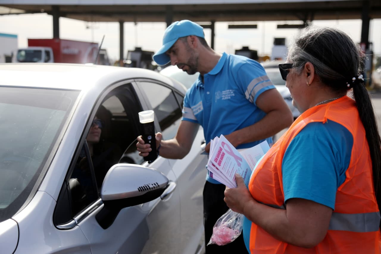 Los ministros de Transporte y de Salud de la provincia de Buenos Aires, Martín Marinucci y Nicolás Kreplak, estuvieron presentes en el Peaje Hudson para concientizar a las y los conductores sobre los riesgos del cáncer de mama e importancia de la prevención. Además, se constató documentación vehicular y cumplimiento de la Ley de Alcohol Cero al Volante.