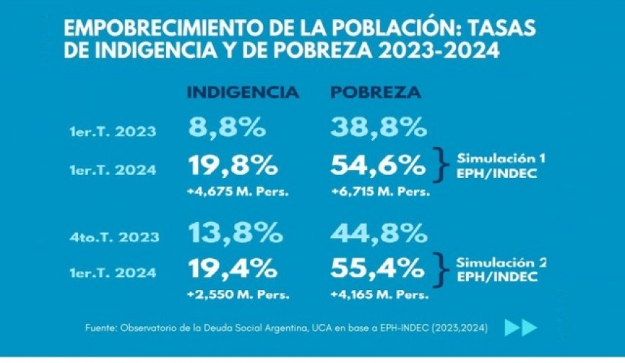 Según datos oficiales mencionados por Infobae y basados en la Encuesta Permanente de Hogares (EPH) del Indec, el ODSA había informado anteriormente que la pobreza afectaba al 55,5% de la población y la indigencia al 18,5%.